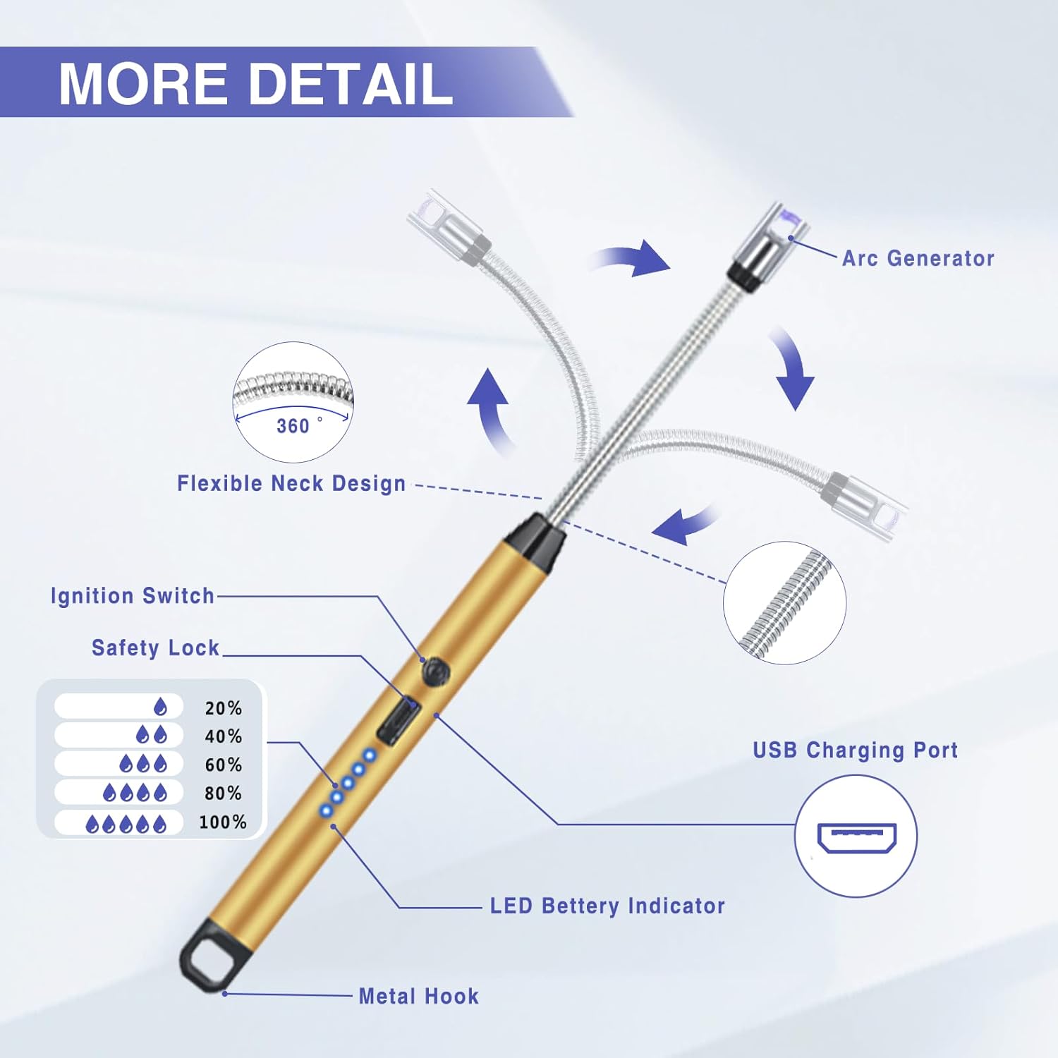 2 PCS Candle Lighter, Electric Lighter Arc Windproof Flameless with 360° Flexible Neck & LED Power Display, Lighters for Candle for BBQ, Grill, Camping, Fireplace, Stove