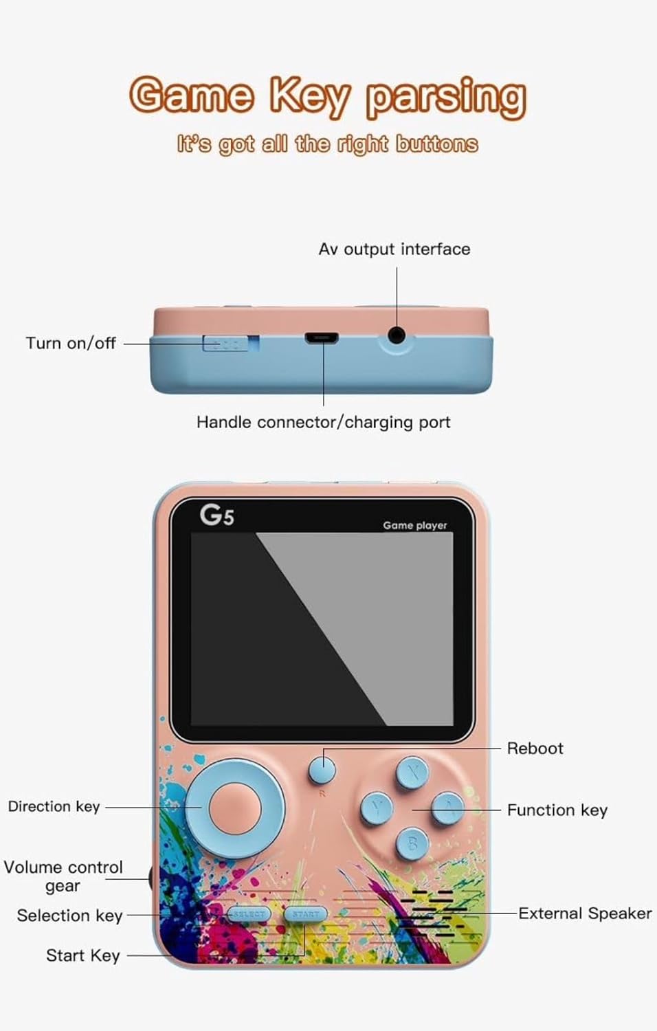 G5 Game Key Parsing Handheld Game Player, 5-inch Display, AV Output, Rechargeable