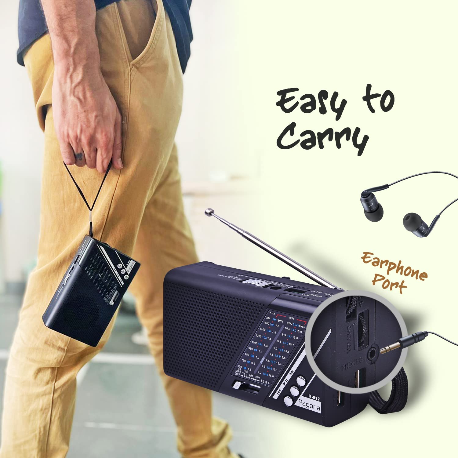 Brand PAGARIA Manufacturer Melody Electronics, Melody Electronics, Model FE-R917 Model Name PAGARIA PORTABLE FM/AM/SW RADIO WITH 5 WATTS SPEAKER Product Dimensions 13.8 x 4.8 x 8.5 cm; 300 ...